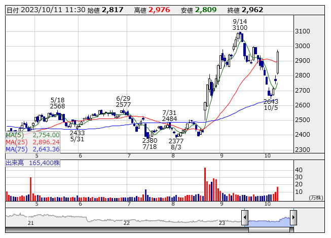 近鉄百 <日足> 「株探」多機能チャートより上期において、子会社シュテルン近鉄における輸入自動車の販売や、近創において大口工事が好調に推移したことに加えて、単体でも水道光熱費や改装工事費用が想定を下回っていることが寄与する。