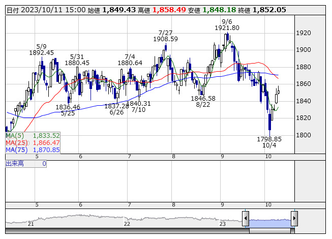 2023年10月11日15時17分 【市況】東証REIT指数先物:11日清算値=0.5ポイント安、1841.5ポイント REIT指数 <日足> 「株探」多機能チャートより 11日15時15分、東証REIT指数先物期近2023年12月限は前日清算値比0.5ポイント安の1841.5ポイントで取引を終えた。出来高は111枚だった。この日の東証REIT指数の現物終値1852.05ポイントに対しては10.55ポイント安。 株探ニュース