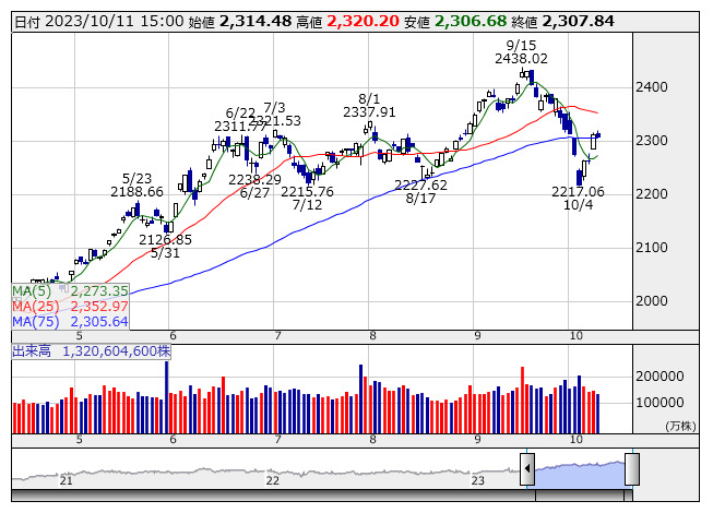 2023年10月11日15時17分 【市況】TOPIX先物:11日清算値=1.5ポイント安、2304.5ポイント TOPIX <日足> 「株探」多機能チャートより 11日15時15分、TOPIX先物期近2023年12月限は前日清算値比1.5ポイント安の2304.5ポイントで取引を終えた。出来高は6万5838枚だった。この日のTOPIXの現物終値2307.84ポイントに対しては3.34ポイント安。 株探ニュース