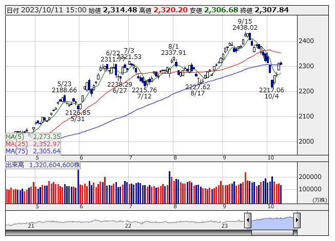 2307.75ポイント 一目均衡表・先行スパン1(雲上限)