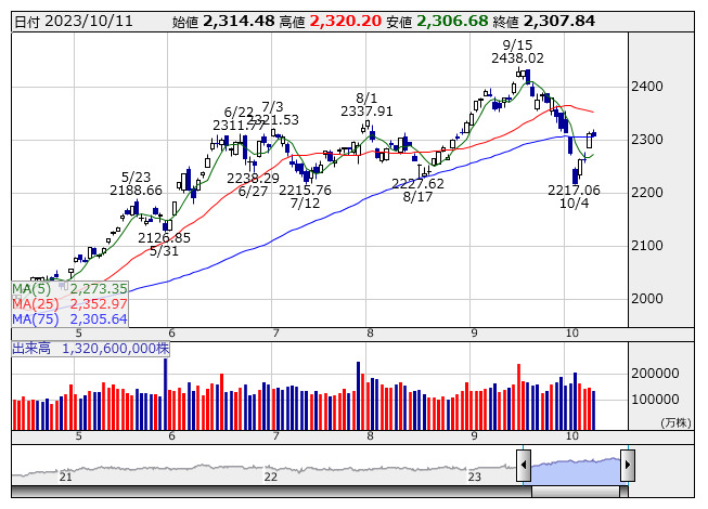 2023年10月12日08時46分 【市況】TOPIX先物:12日寄り付き=14.5ポイント高、2319ポイント TOPIX <日足> 「株探」多機能チャートより 12日8時45分、TOPIX先物期近2023年12月限は前日清算値比14.5ポイント高の2319ポイントで寄り付いた。前日のTOPIXの現物終値2307.84ポイントに対しては11.16ポイント高。夜間取引の終値2312ポイントに対しては7ポイント高となっている。 株探ニュース