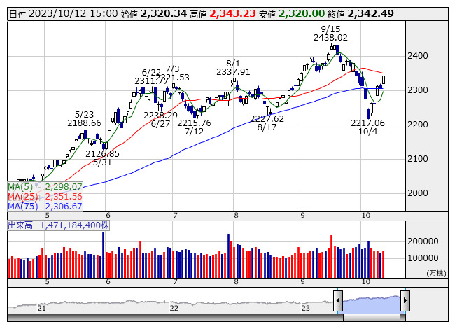 2023年10月12日15時17分 【市況】TOPIX先物:12日清算値=40ポイント高、2344.5ポイント TOPIX <日足> 「株探」多機能チャートより 12日15時15分、TOPIX先物期近2023年12月限は前日清算値比40ポイント高の2344.5ポイントで取引を終えた。出来高は5万5473枚だった。この日のTOPIXの現物終値2342.49ポイントに対しては2.01ポイント高。 株探ニュース
