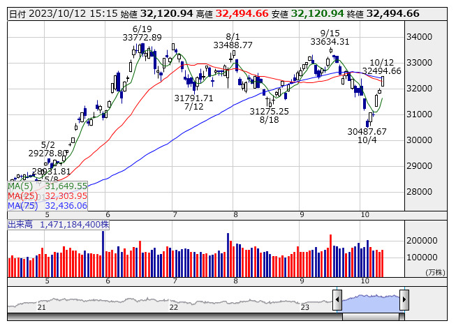 2023年10月12日16時31分 【市況】日経225先物:12日夜間取引寄り付き=30円安、3万2610円 日経平均 <日足> 「株探」多機能チャートより 12日16時30分、大阪取引所の日経225先物期近2023年12月限は日中取引の清算値比30円安の3万2610円で寄り付いた。日経平均株価の現物終値3万2494.66円に対しては115.34円高。 株探ニュース