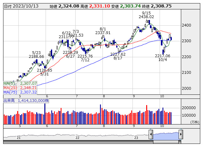 2023年10月16日08時46分 【市況】TOPIX先物:16日寄り付き=10ポイント安、2295.5ポイント TOPIX <日足> 「株探」多機能チャートより 16日8時45分、TOPIX先物期近2023年12月限は前週末清算値比10ポイント安の2295.5ポイントで寄り付いた。前週末のTOPIXの現物終値2308.75ポイントに対しては13.25ポイント安。夜間取引の終値2287ポイントに対しては8.5ポイント高となっている。 株探ニュース