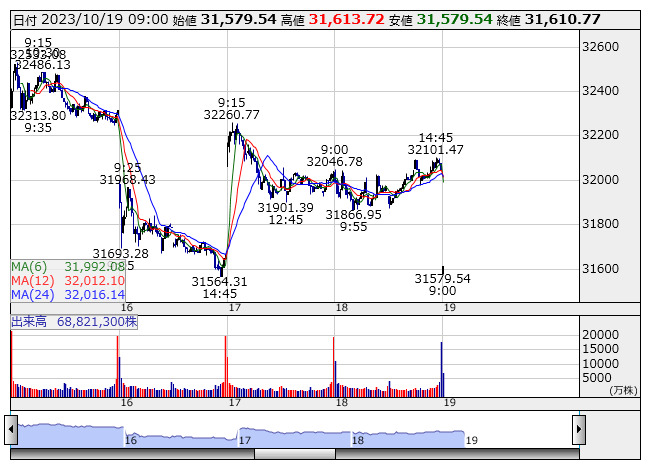2023年10月19日09時02分 【市況】日経平均19日寄り付き=462円安、3万1579円 日経平均 <5分足> 「株探」多機能チャートより 19日の日経平均株価は前日比462.71円安の3万1579.54円で寄り付いた。 株探ニュース