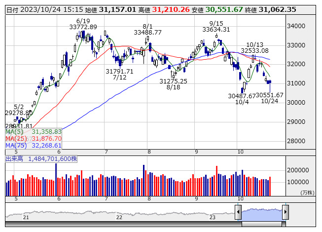 2023年10月24日16時31分 【市況】日経225先物:24日夜間取引寄り付き=変わらず、3万1150円 日経平均 <日足> 「株探」多機能チャートより 24日16時30分、大阪取引所の日経225先物期近2023年12月限は日中取引の清算値比変わらずの3万1150円で寄り付いた。日経平均株価の現物終値3万1062.35円に対しては87.65円高。 株探ニュース