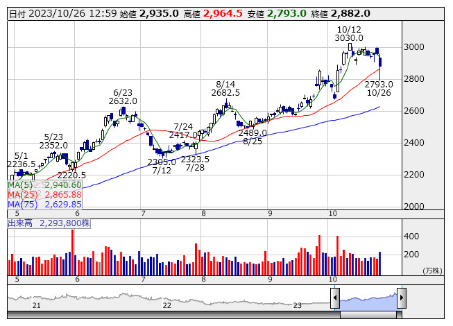 2023年10月26日12時57分 【材料】日本取引所が後場下げ幅拡大、7~9月期増益率鈍化と株主優待廃止が売りを促す 日本取引所 <日足> 「株探」多機能チャートより 日本取引所グループ<8697>が後場に下げ幅を拡大した。26日、24年3月期第2四半期累計(4~9月)の連結決算を発表。営業収益は前年同期比10.4%増の733億8500万円、純利益は同35.5%増の314億3200万円となった。同社は9月に通期の業績と配当予想の上方修正を発表している。純利益の通期計画に対する進捗率は58%と順調だったが、7~9月期の純利益の増益率は23%と、4~6月期の47%に比べて鈍化しており、業況に対する慎重な見方が広がったようだ。加えて、同社は株主優待制度の廃止を発表しており、個人投資家の売りを促す一因となったとみられている。 日本取引所は継続保有年数に応じ、定時株主総会終了後の毎年6月に1000~4000円分のQUOカードを贈呈する株主優待制度を実施していた。株主の平等性確保の観点から公平な利益還元のあり方について検討した結果、今後は配当などによる利益還元に集約することにしたという。 出所:MINKABU PRESS