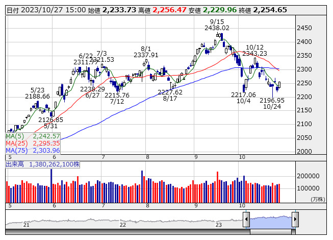 2023年10月27日15時17分 【市況】TOPIX先物:27日清算値=32.5ポイント高、2256ポイント TOPIX <日足> 「株探」多機能チャートより 27日15時15分、TOPIX先物期近2023年12月限は前日清算値比32.5ポイント高の2256ポイントで取引を終えた。出来高は7万7616枚だった。この日のTOPIXの現物終値2254.65ポイントに対しては1.35ポイント高。 株探ニュース