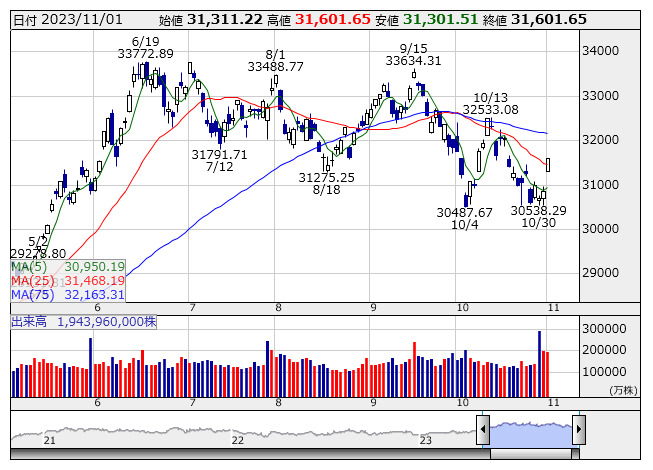 2023年11月02日08時46分 【市況】日経225先物:2日寄り付き=430円高、3万2030円 日経平均 <日足> 「株探」多機能チャートより 2日8時45分、大阪取引所の日経225先物期近2023年12月限は前日清算値比430円高の3万2030円で寄り付いた。前日の日経平均株価の現物終値3万1601.65円に対しては428.35円高。夜間取引の終値3万1890円に対しては140円高となっている。 株探ニュース
