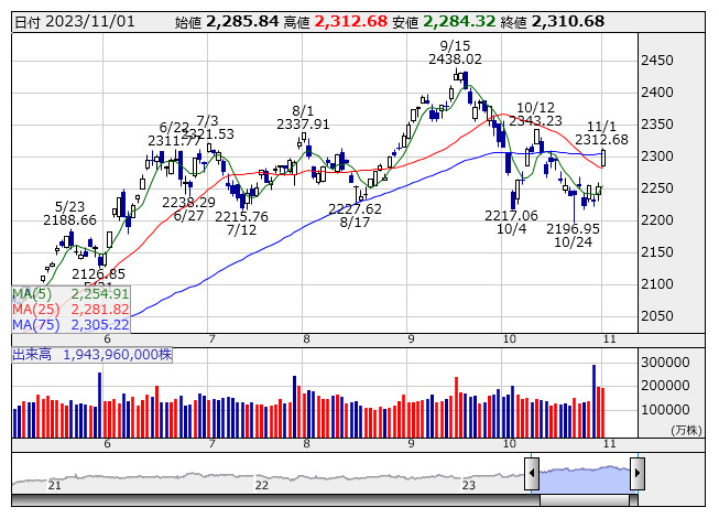 2023年11月02日08時46分 【市況】TOPIX先物:2日寄り付き=24.5ポイント高、2337ポイント TOPIX <日足> 「株探」多機能チャートより 2日8時45分、TOPIX先物期近2023年12月限は前日清算値比24.5ポイント高の2337ポイントで寄り付いた。前日のTOPIXの現物終値2310.68ポイントに対しては26.32ポイント高。夜間取引の終値2330ポイントに対しては7ポイント高となっている。 株探ニュース
