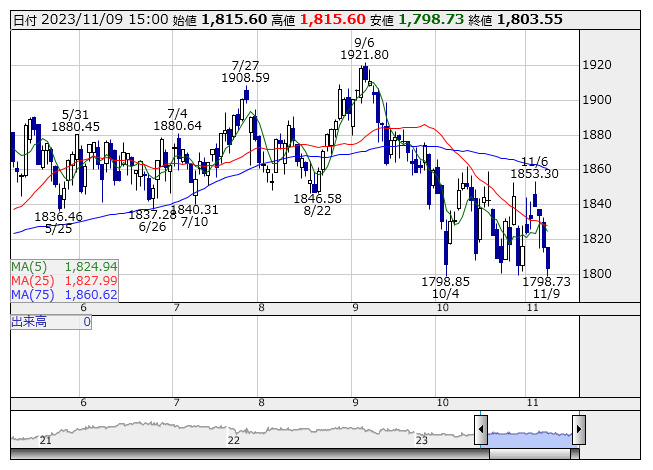 2023年11月09日15時17分 【市況】東証REIT指数先物:9日清算値=15.5ポイント安、1797ポイント REIT指数 <日足> 「株探」多機能チャートより 9日15時15分、東証REIT指数先物期近2023年12月限は前日清算値比15.5ポイント安の1797ポイントで取引を終えた。出来高は600枚だった。この日の東証REIT指数の現物終値1803.55ポイントに対しては6.55ポイント安。 株探ニュース