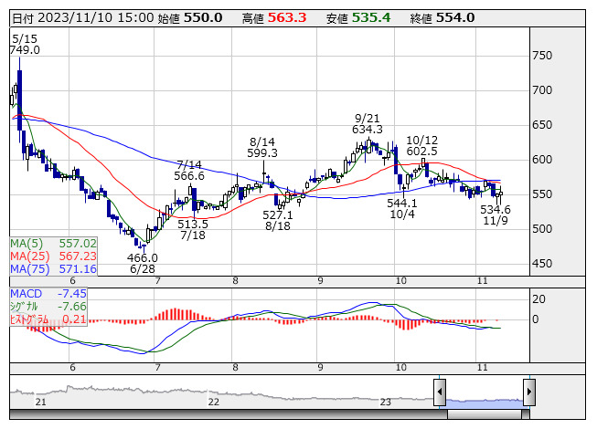 楽天グループ <日足> MACD 「株探」多機能チャートより●MACDが買いサイン銘柄(市場人気順) ★MACDがゼロ以下でシグナルを上抜いた銘柄