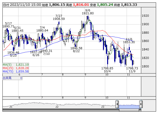 2023年11月10日15時17分 【市況】東証REIT指数先物:10日清算値=10.5ポイント高、1807.5ポイント REIT指数 <日足> 「株探」多機能チャートより 10日15時15分、東証REIT指数先物期近2023年12月限は前日清算値比10.5ポイント高の1807.5ポイントで取引を終えた。出来高は169枚だった。この日の東証REIT指数の現物終値1813.33ポイントに対しては5.83ポイント安。 株探ニュース
