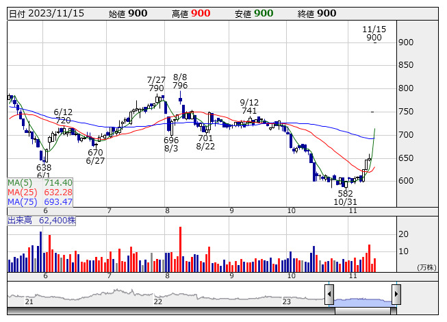 ヌーラボ <5033> 1,120 +116 (+11.6%) 34,500 ( 3,867) 34,700 ( 3,886)