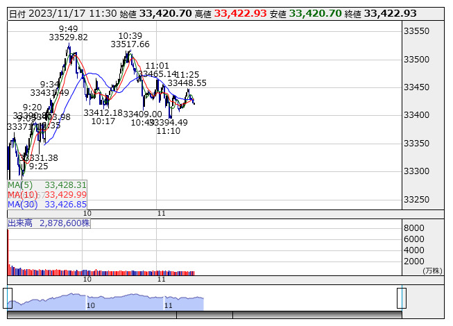 【市況】日経平均17日前引け=続落、1円安の3万3422円
