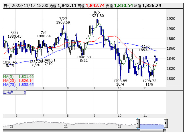 2023年11月17日15時17分 【市況】東証REIT指数先物:17日清算値=9ポイント安、1830.5ポイント REIT指数 <日足> 「株探」多機能チャートより 17日15時15分、東証REIT指数先物期近2023年12月限は前日清算値比9ポイント安の1830.5ポイントで取引を終えた。出来高は1382枚だった。この日の東証REIT指数の現物終値1836.29ポイントに対しては5.79ポイント安。 株探ニュース