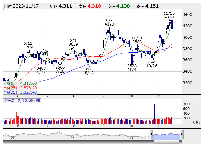 住友不 <日足> 「株探」多機能チャートより(東証プライム上場 1658 銘柄対象)