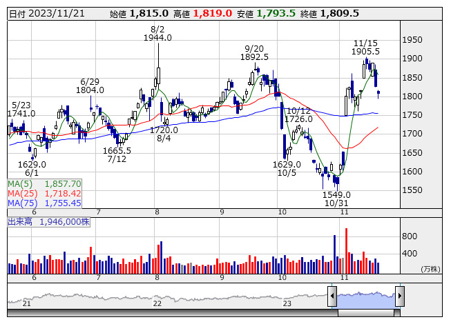住友電 <日足> 「株探」多機能チャートより(東証プライム上場 1658 銘柄対象)