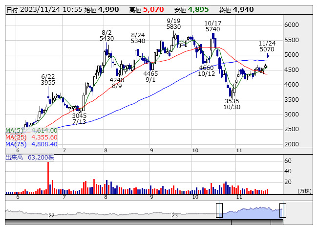 2934>が大幅高で4日続伸し、5000円の大台に乗せる場面があった。24日付の日本経済新聞朝刊が、「厚生労働省は対面販売の義務が残っていた一部の薬について、ビデオ通話による服薬指導を条件にインターネットでの購入を2025年以降に認める」と報じた。対面販売の義務が残る「要指導医薬品」に関し、オンラインでの服薬指導があれば、非対面での購入を認める方向だと伝えている。オンライン診療・服薬指導と処方薬宅配のプラットフォーム「SOKUYAKU」を運営するジェイフロに対しては、利用者の更なる拡大と業績へのポジティブな影響を見込んだ買いが入ったようだ。