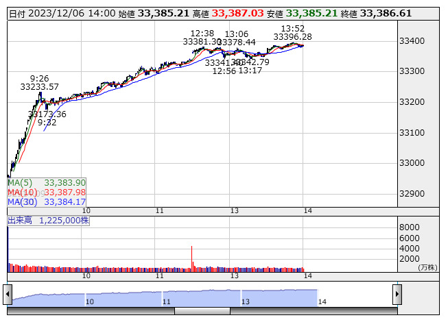 【市況】14時の日経平均は609円高の3万3385円、ファストリが74.93円押し上げ