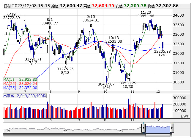 2023年12月08日15時17分 【市況】日経225先物:8日清算値=660円安、3万2200円 日経平均 <日足> 「株探」多機能チャートより 8日15時15分、大阪取引所の日経225先物期近2024年3月限は前日清算値比660円安の3万2200円で取引を終えた。出来高は9万9473枚だった。この日の日経平均株価の現物終値3万2307.86円に対しては107.86円安。 株探ニュース