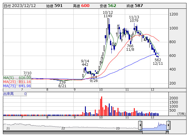 2375>はストップ高買い気配。前日に23年10月期の決算を発表、営業利益は1.1億円で前年同期比74.9%減となったが、従来予想の1.4億円の赤字は上振れ着地。未定としていた年間配当金は4円にするとしている。また、24年10月期営業利益は2.1億円で同84.6%増の見通し、配当金は5円を計画している。業績底打ち期待の高まりに加えて、秋元康らとの共同出資による合弁会社Green Lightの設立、24年1月からの事業開始発表も材料視。