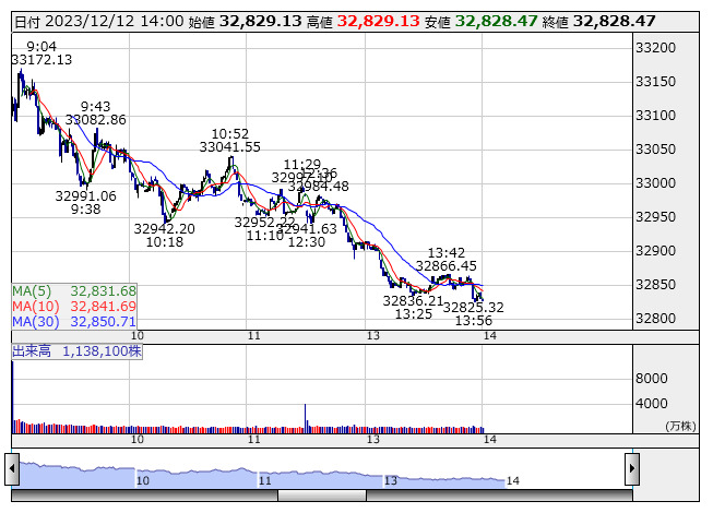 【市況】14時の日経平均は36円高の3万2828円、東エレクが25.97円押し上げ