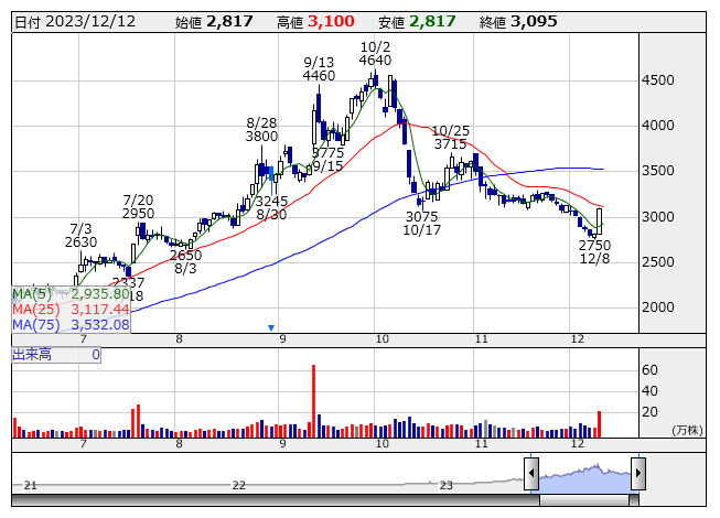 2023年12月12日14時26分 【材料】山岡家---ストップ高買い気配、業績予想の大幅上方修正がインパクトに 山岡家 <日足> 「株探」多機能チャートより 山岡家<3399>はストップ高買い気配。前日に第3四半期決算を発表、累計営業利益は13.5億円で前年同期比4.1倍となっている。また、通期予想は従来の10億円から18億円、前期比3.5倍の水準にまで上方修正。来店客数の高い伸びが継続しているほか、一部商品の価格改定効果で利益率も上昇しているもよう。上半期までの状況から上振れ期待はあったとみられるが、修正幅の大きさがポジティブなインパクトにつながっている。 《ST》 提供:フィスコ