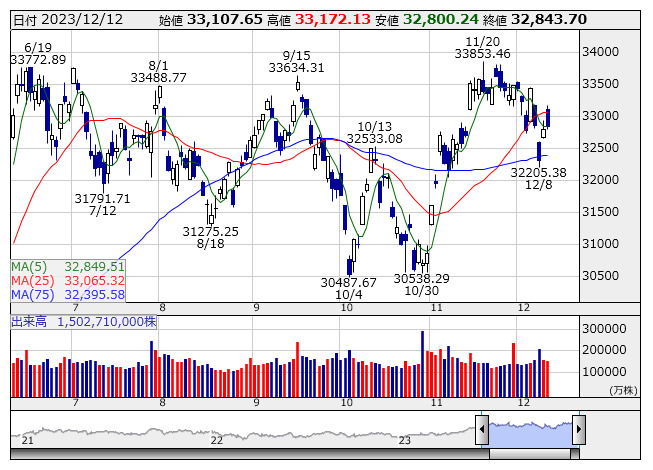 13日の東京株式市場は主力株を中心に幅広くリスクを取る動きが継続、日経平均株価は3万3000円近辺で頑強な値動きが続きそうだ。前日の米国株市場ではNYダウ、ナスダック総合株価指数ともに上昇した。朝方に発表された11月の米消費者物価指数(CPI)は事前コンセンサスと一致する内容だった。下振れを期待していた向きもあり、取引開始直後はハイテク株などを中心にやや軟調だったものの、その後は徐々に買いが優勢となった。米債券市場で長期債が買われ、朝方は高かった米10年債利回りが低下基調となったことが投資家心理を改善させている。NYダウは一時190ドルを超える上昇をみせる場面もあった。東京市場は前日に日経平均が上値を指向したものの、朝方にこの日の高値をつけ、その後は一貫して上げ幅を縮小する動きとなった。米株市場ではビッグイベントであった米CPI発表を無難に通過したこともあり、きょうは安心感から買いが先行しそうだが、日本時間あす未明に発表されるFOMCの結果とパウエルFRB議長の記者会見を控え、積極的に上値を買い進む動きは見込みにくい。岸田政権の安倍派閣僚4人が更迭される見通しにあり、国内政局不安も株式市場の上値を重くする可能性がある。