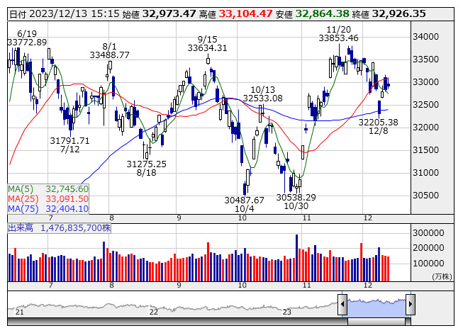 2023年12月13日16時31分 【市況】日経225先物:13日夜間取引寄り付き=30円高、3万2860円 日経平均 <日足> 「株探」多機能チャートより 13日16時30分、大阪取引所の日経225先物期近2024年3月限は日中取引の清算値比30円高の3万2860円で寄り付いた。日経平均株価の現物終値3万2926.35円に対しては66.35円安。 株探ニュース
