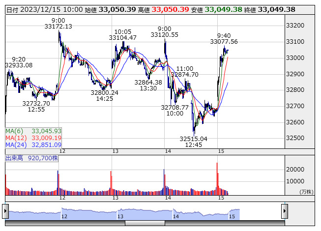 【市況】10時の日経平均は363円高の3万3049円、アドテストが75.39円押し上げ