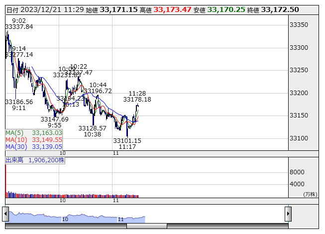 【市況】日経平均21日前引け=3日ぶり反落、504円安の3万3171円