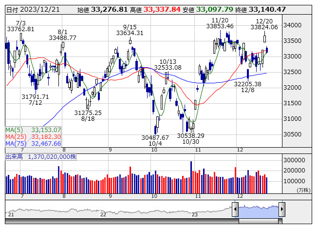 2023年12月22日07時52分 【市況】シカゴ日経平均先物 大取終値比 130円高 (12月21日) 日経平均 <日足> 「株探」多機能チャートよりシカゴ日経225先物3月限 (円建て) 33250 ( +130 ) シカゴ日経225先物3月限 (ドル建て) 33310 ( +190 ) ※( )は大阪取引所終値比 株探ニュース