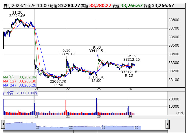 【市況】10時の日経平均は20円高の3万3274円、レーザーテクが10.39円押し上げ