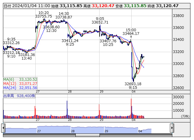 【市況】11時の日経平均は343円安の3万3120円、東エレクが124.88円押し下げ