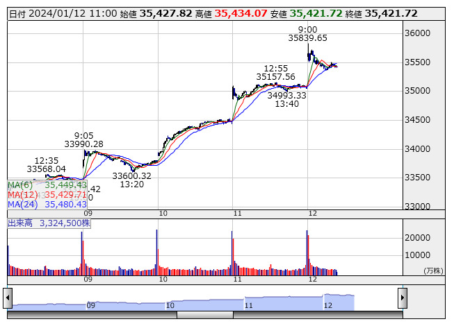 【市況】11時の日経平均は379円高の3万5429円、ファストリが199.80円押し上げ