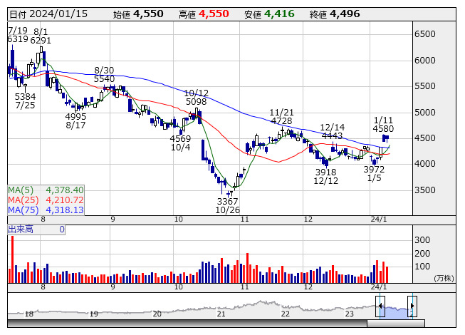そのほか、T&S <4055> やオキサイド <6521> も売り気配を切り下げている。