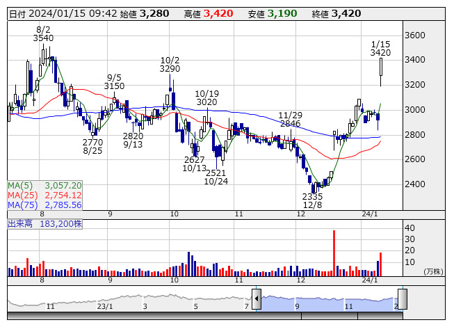 ストップ高。24年11月期の営業利益予想を前期比22.0%増の10.20億円と発表している。上期に成長に向けた人材投資を実施し、下期以降に利益貢献の効果を期待するとしている。年間配当予想は95.00円(前期77.00円)で増配見通し。このうち中間配当として47.00円(前年同期は無配)を実施する予定。23年11月期の営業利益は36.9%増の8.36億円で着地した。エンジニア数が順調に増加し、早期稼働に結び付いたことなどが増益に寄与した。