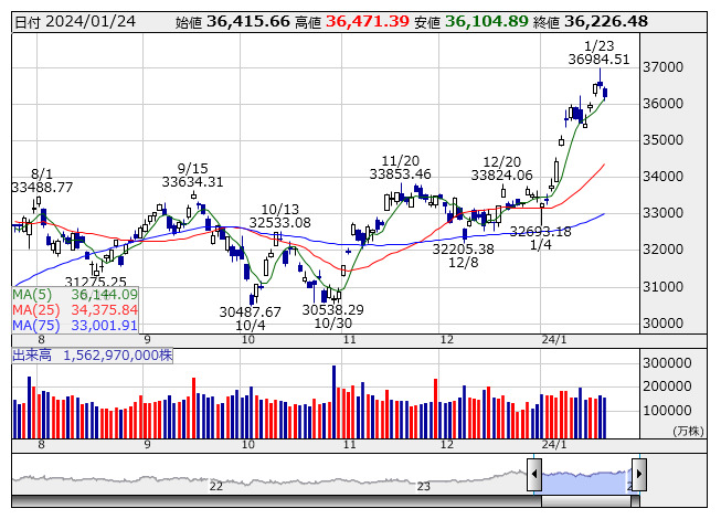 2024年01月25日07時54分 【市況】シカゴ日経平均先物 大取終値比 15円安 (1月24日) 日経平均 <日足> 「株探」多機能チャートよりシカゴ日経225先物3月限 (円建て) 36245 ( -15 ) シカゴ日経225先物3月限 (ドル建て) 36280 ( +20 ) ※( )は大阪取引所終値比 株探ニュース