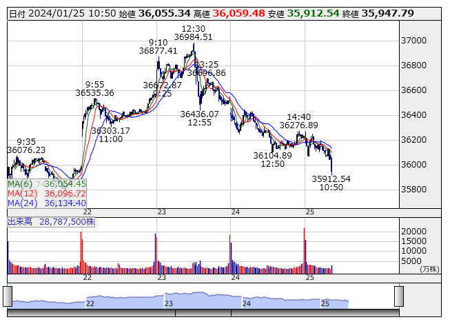 2024年01月25日10時53分 【市況】日経平均の下げ幅が300円を超える 日経平均 <5分足> 「株探」多機能チャートより 日経平均株価の下げ幅が300円を超えた。10時52分現在、313.94円安の3万5912.54円まで下落している。 株探ニュース