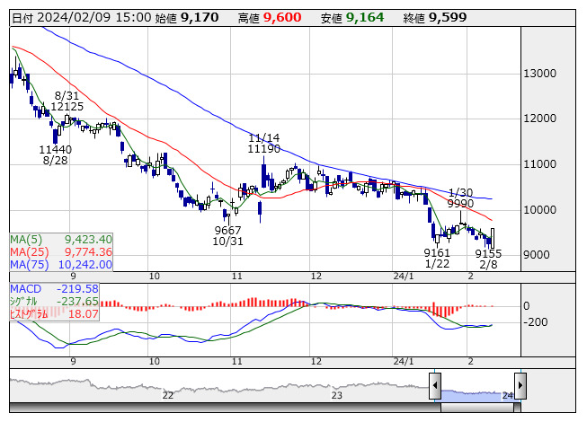 <4922> コーセー 9599 +334 ( +3.6%) -219.6