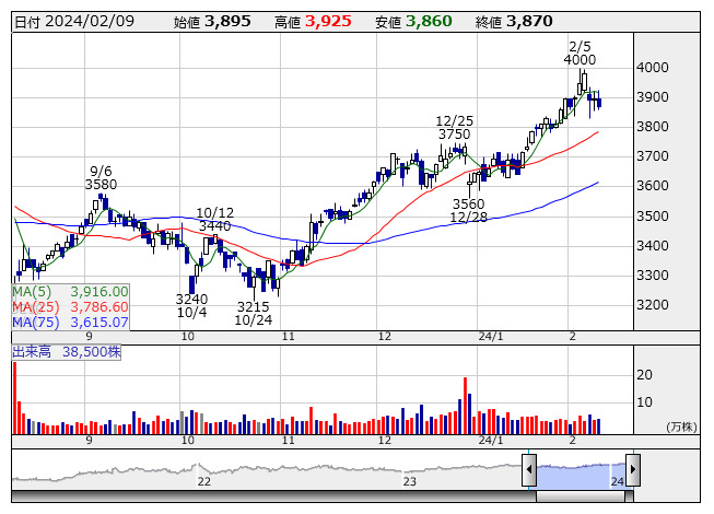 コクサイエレ <6525> 4,240 +140 ( +3.4%) 129,900 ( 55,142) 121,000 ( 51,304)