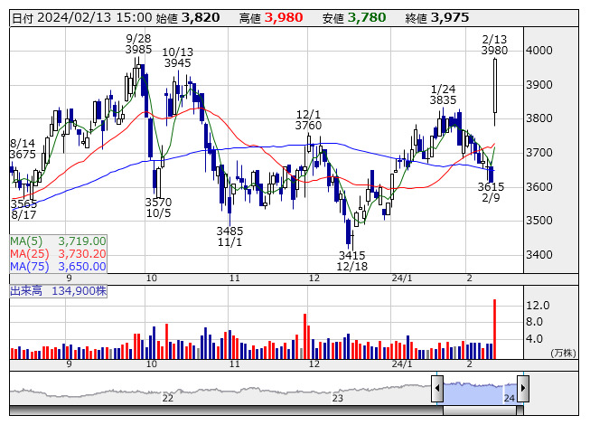 9日に決算を発表。「4-12月期(3Q累計)経常が18%増益で着地・10-12月期も47%増益」が好感された。