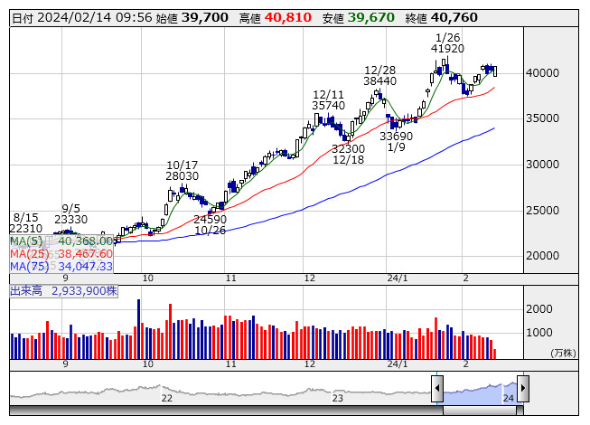 NVDA>が一時プラス圏に浮上するなど強さを発揮、引き続き同関連株への投資マネーの注目度が高いことをうかがわせる。東京市場では前日に東エレクが業績予想の上方修正を素直に好感され4000円近い大幅高を演じたが、きょうも海外投資家の実需買いが反映される形で上値指向を継続し、最高値街道を走っている。また、エヌビディアとの取引実績の高いアドテストも連日の上場来高値更新と気を吐いている。半導体セクターは外国為替市場で足もとドル高・円安方向に振れていることも追い風となっている。