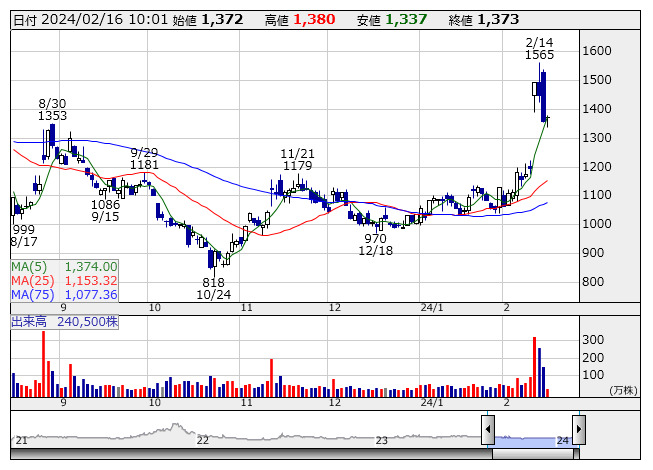 エネチェンジ <日足> 「株探」多機能チャートより今月9日に発表した23年12月期連結決算は、売上高が前の期比77.4%増の66億2500万円、営業損益が前の期実績(11億2100万円の赤字)から赤字幅縮小となる10億6600万円の赤字で着地した。電力・ガス切り替えサービスが好調だったほか、EV充電サービスが大幅に伸び全体業績を牽引した。今期予想は売上高のみ開示し、前期比50.9%増の100億円とした。(イ)
