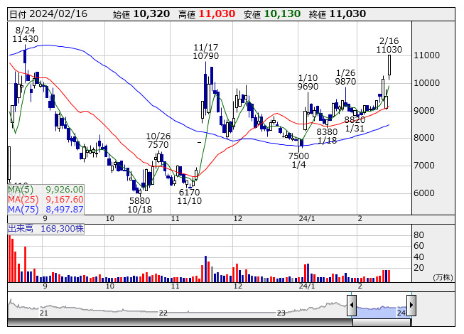 ヘッドウォ <4011> 13,790 +2,760 (+25.0%) 20,300 ( 28,014) 20,200 ( 27,855)