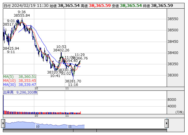 【市況】日経225先物:19日正午=270円安、3万8340円