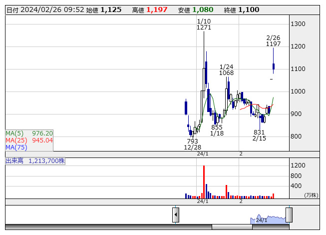 ナルネット <日足> 「株探」多機能チャートより※出来高変化率ランキングでは、直近5日平均の出来高と配信当日の出来高を比較することで、物色の傾向など市場参加者の関心を知ることができます。