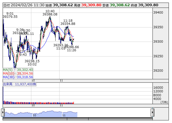 【市況】日経225先物:26日正午=170円高、3万9290円