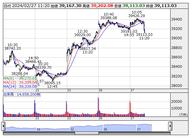2024年02月27日11時23分 【市況】日経平均の下げ幅が100円を超える 日経平均 <5分足> 「株探」多機能チャートより 日経平均株価の下げ幅が100円を超えた。11時22分現在、105.22円安の3万9128.49円まで下落している。 株探ニュース